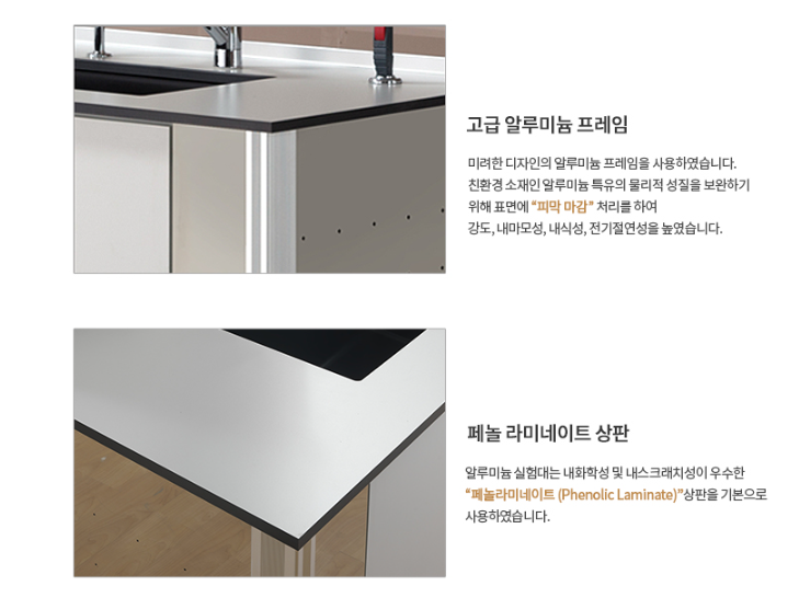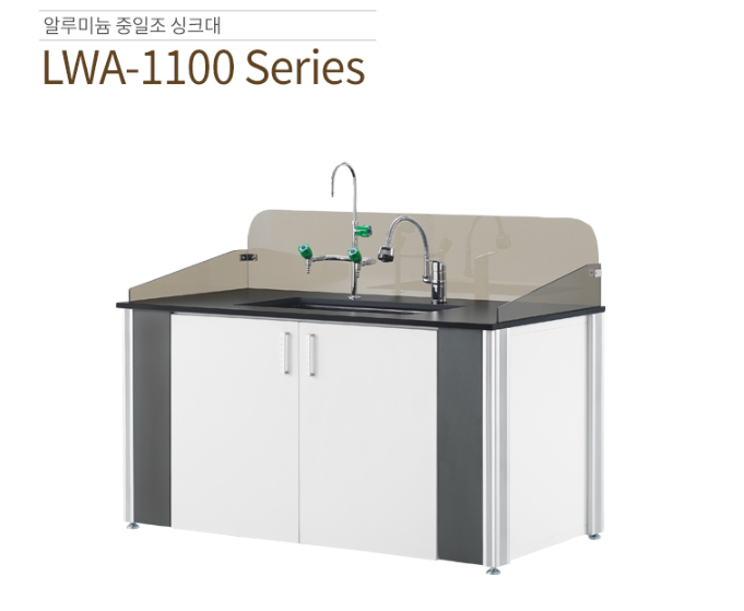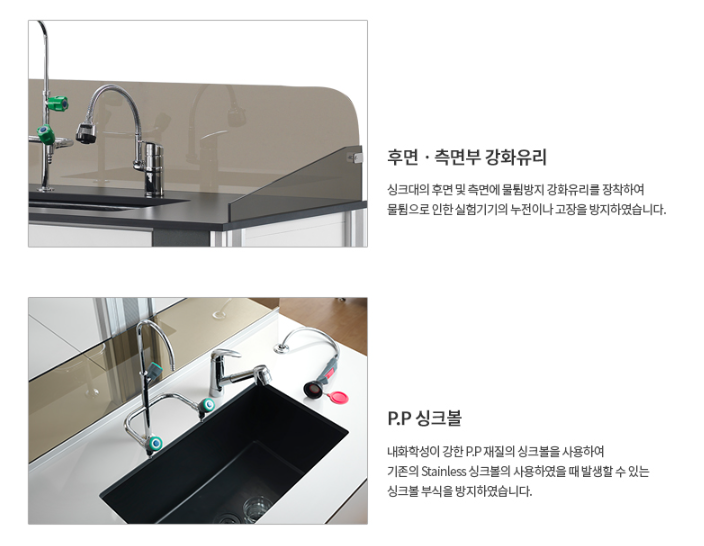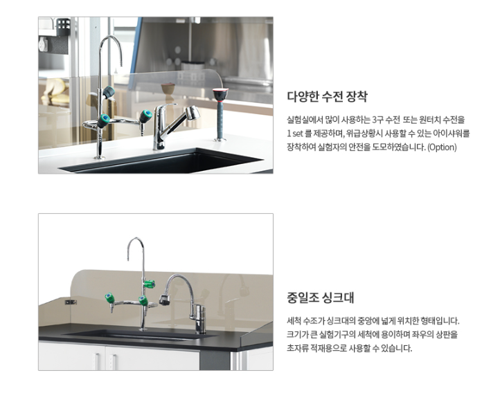 제품특징▶알루미늄 형태의 실험실용 싱크대입니다.▶피막 마감 처리로 기능성 및 디자인효과 극대화하였습니다.▶연구원의 편의성을 극대화시킨 중일조의 수조형태를 취하였습니다.▶내화학성 및 내부식성 뛰어난 페놀라이네미트와 P.P수지 수조를 사용하였습니다.▶3구 수전 또는 냉온수 수전 1세트를 제공합니다. (옵션 : 추가장착가능)▶안전설비인 아이샤워 부착이 가능합니다. (옵션)▶BODY는 화이트색상을 사용하여 밝은 실험실 환경을 유지할 수 있습니다.