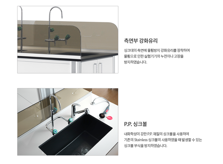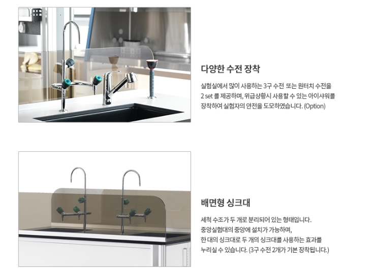 제품특징▶알루미늄 형태의 실험실용 싱크대입니다.▶피막 마감 처리로 기능성 및 디자인효과 극대화하였습니다.▶연구원의 용도에 맞게 사용가능한 배면형 싱크대입니다.▶내화학성 및 내부식성 뛰어난 페놀라이네미트와 P.P수지 수조를 사용하였습니다.▶중앙실험대의 중앙에 설치가 가능한 배면형 싱크대입니다.(3구수전 장착)▶안전설비인 아이샤워 부착이 가능합니다. (옵션)▶BODY는 화이트색상을 사용하여 밝은 실험실 환경을 유지할 수 있습니다.